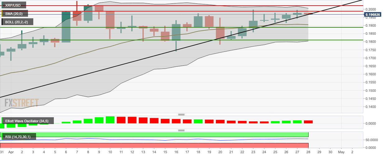 XRP/USD dropped from $0.1977 to $0.1970 in the early hours of Tuesday, as the bears took control following seven consecutive bullish days. The price is currently flirting with the upward trending line, as it has dipped a little below it. The 20-day Bollinger jaw is slowly narrowing, which indicates decreasing price volatility.