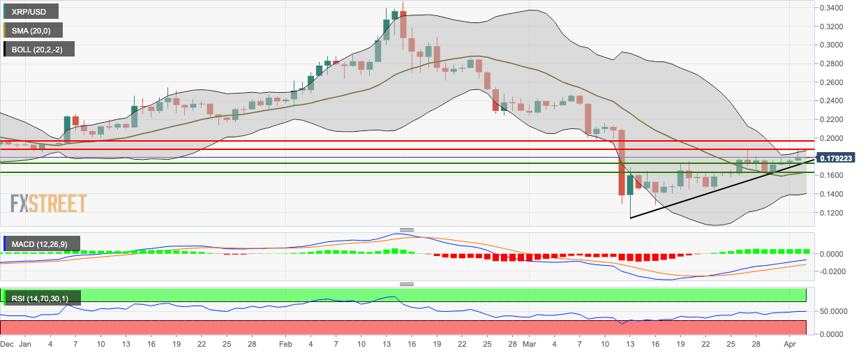 XRP/USD went up from $0.1785 to $0.1794 in the early hours of Friday. In the process, the buyers managed to stay in control for the fifth straight day as they broke above the bullish pennant structure. The 20-day Bollinger jaw is widening again, indicating increasing price volatility.