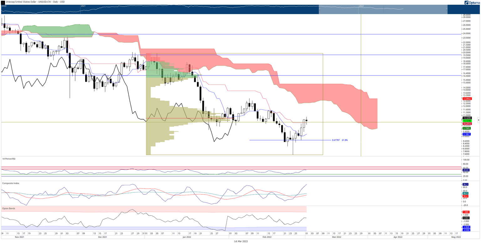 Uniswap price has outperformed nearly every primary cryptocurrency over the past week. From February 24, 2022, to today, UNI rose nearly 44%, from $7.54 to $10.83. Bulls were able to rally UNI above the Kijun-Sen, but global concerns regarding Russia and commodity markets may cause Uniswap to give back some of those gains.