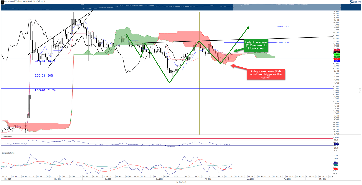 Decentraland price closed Monday with an 11% gain, completing the strongest daily candlestick close since January 31, 2022. Buyers hoped that the momentum would convert into a significant bullish breakout above the Ichimoku Cloud, but MANA has ultimately been hit by the same uncertainty that affected other risk-on assets.