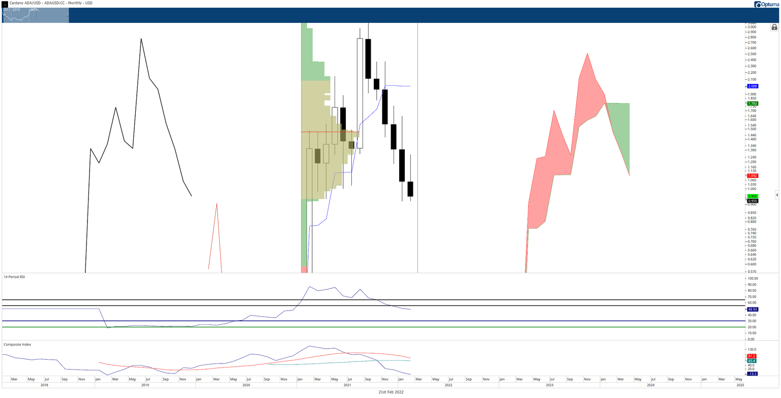 Cardano price action has recently achieved (and developing) some historical behaviors not seen in any of the top ten market cap cryptocurrencies – or nearly the entire altcoin space. Nevertheless, a slow bleed off of value continues, with little sign of it abating until the very end of February 2022