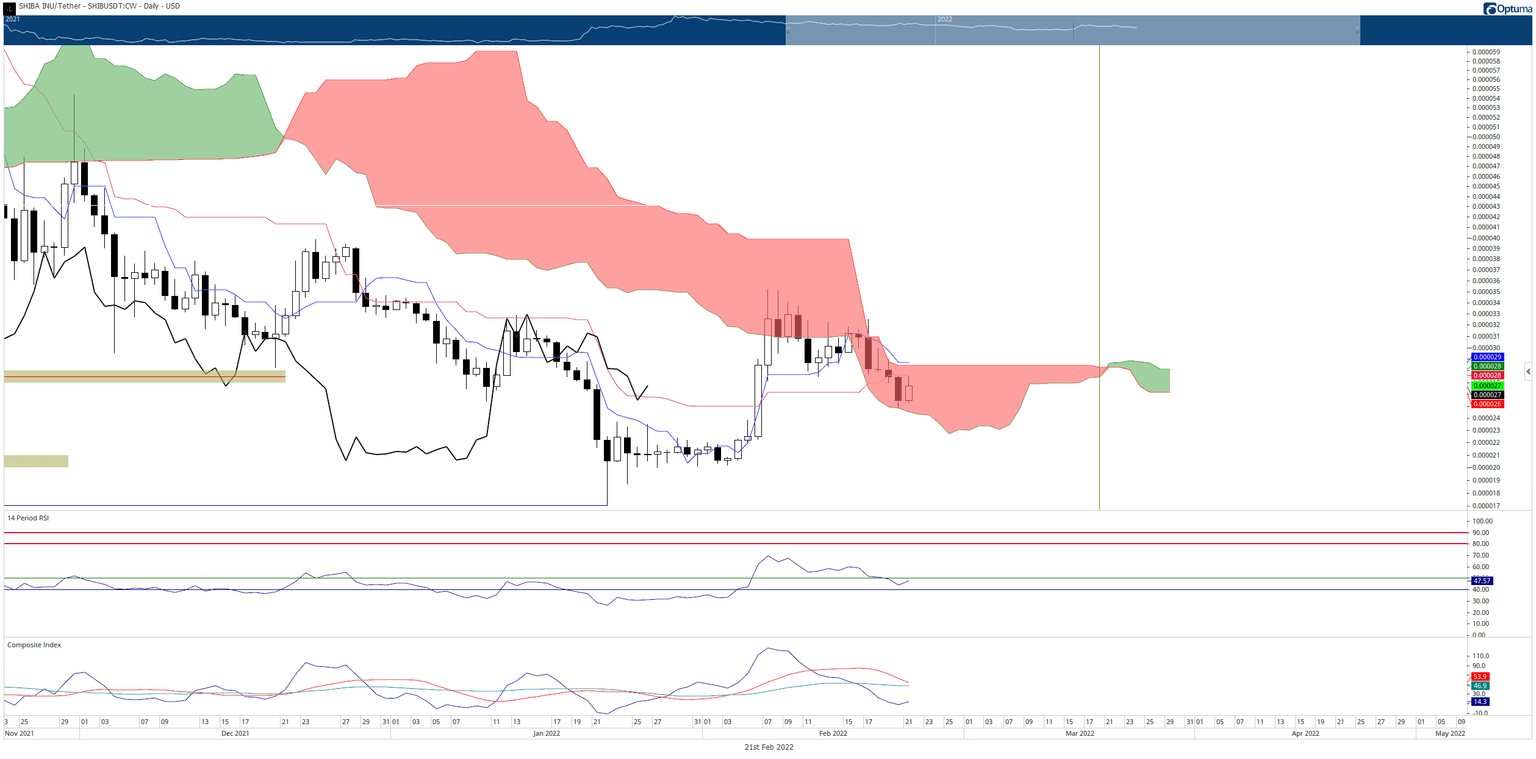 Shiba Inu price faced the same selling pressure experienced by the broader cryptocurrency market this past weekend. Sellers have been in clear control of this market since February 17 and tested the final Ichimoku support level at the bottom of the Cloud (Senkou Span A) but failed to push SHIBA below it.