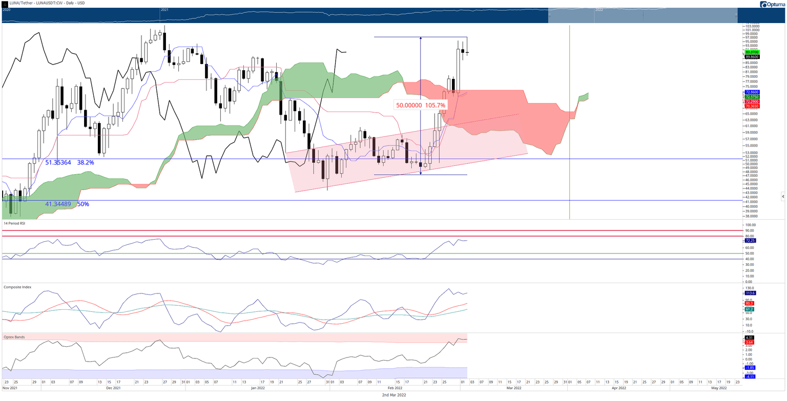 Terra price has had a massive rally over the past week and a half. From the February 20, 2022 low of 47.30, LUNA has moved as high as $93.30, more than doubling LUNA in just ten days. However, the extreme of the move is now showing signs of exhaustion, and a pullback may be coming soon.
