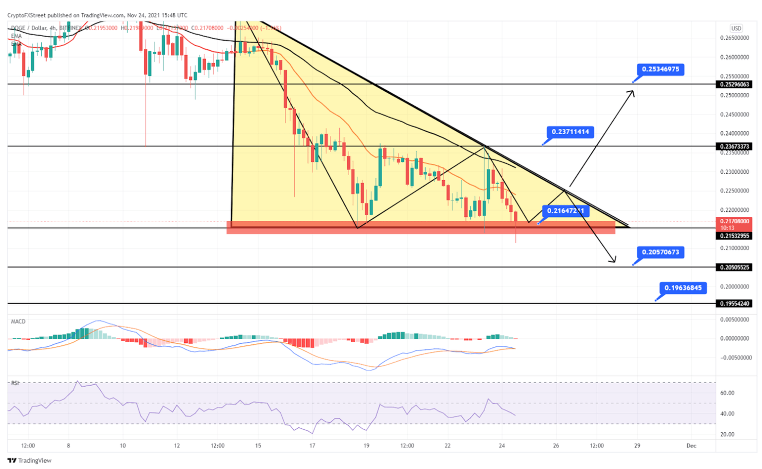 Dogecoin price is exhibiting a sharp downward movement, having dropped to $0.2164 support level. Increased selling pressure can push DOGE even lower despite the significant losses already incurred. It mainly depends on whether the triple bottom support level can hold.