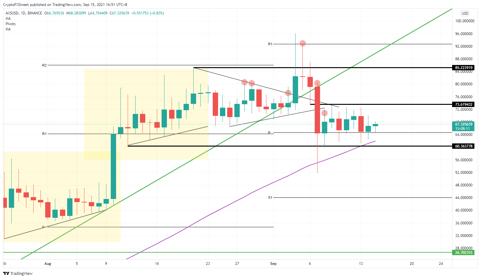 Axie Infinity (AXS) price action is range trading, with a 18% bandwidth. A surplus bullish element with the 55-day Simple Moving Average (SMA) coming into play below the current price is helping buyers gain traction and wash out sellers on the upper end of the range. Once through there, it is a quick spurt towards $85.22.