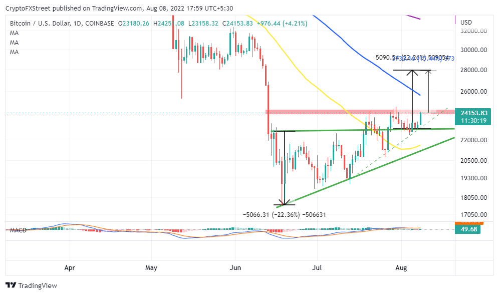 Bitcoin price kicked off the new week on a positive note, climbing 4.50% to trade at $24,086 at the time of writing. The larger cryptocurrency market appears to have flipped green, led by Avalanche’s 11.30% gains, Polkadot’s 9.20%, Solana’s 7.30% and Ethereum’s 6.50%. As for Bitcoin price, fundamentals are growing stronger by the day, thus becoming the main bear market rally drivers.