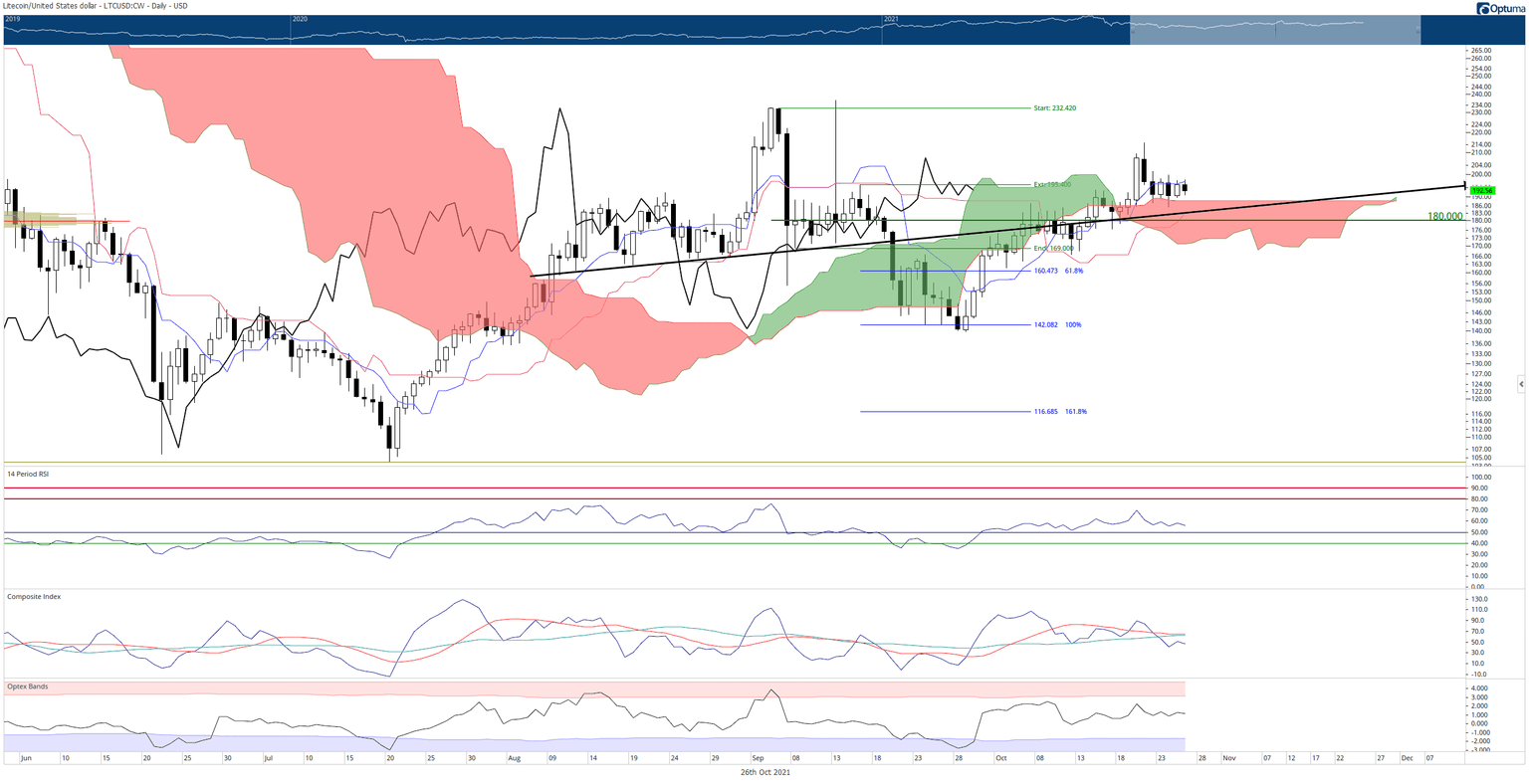 Litecoin price has entered a tight congestion zone since the initial spike above the Cloud on October 20th. The trading range has been limited to the Tenkan-Sen at $196 above and Senkou Span B at $188 below. Thus, Litecoin has prime conditions for a bullish expansion move to occur, but bulls are unable or unwilling to make that happen.