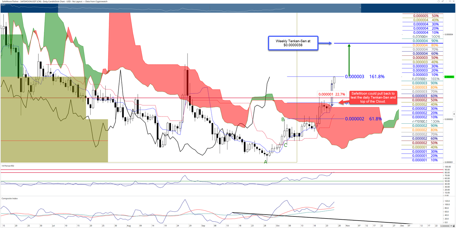 SafeMoon price has made some astounding progress in October, rallying over 145% from the lowest open in its history on the first day of October to its present new two-month high. After hitting the required $0.0000024 level above the Cloud, SafeMoon spiked on Monday for a gain of over 22%. And it is likely to continue a move higher before facing any resistance.