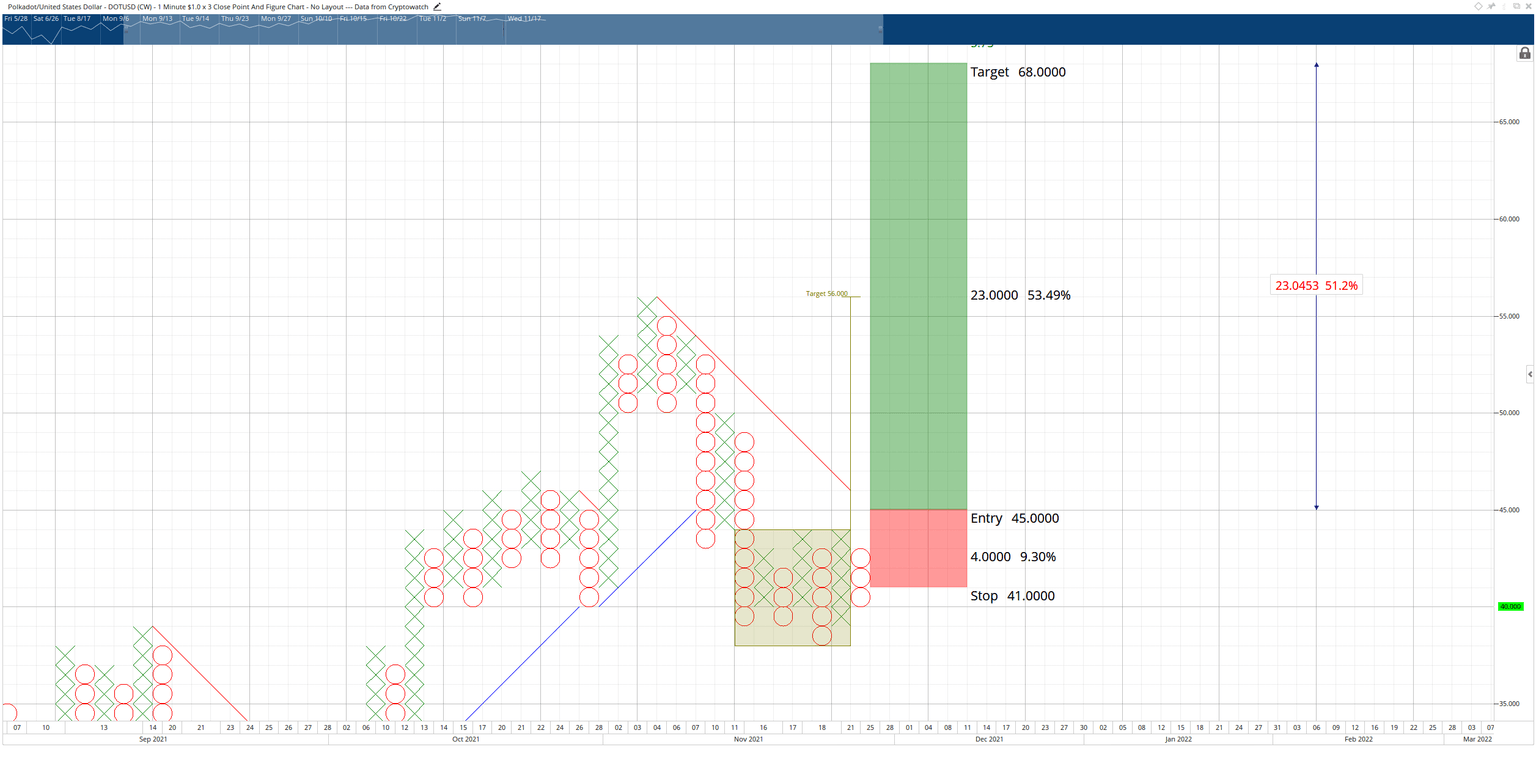 Polkadot price has two powerful Point and Figure patterns in development. As a result, strong movement in the direction of either entry is expected – but the trend favors the long side of the trade. Polkadot price has two trade setups developing on its Point and Figure chart.