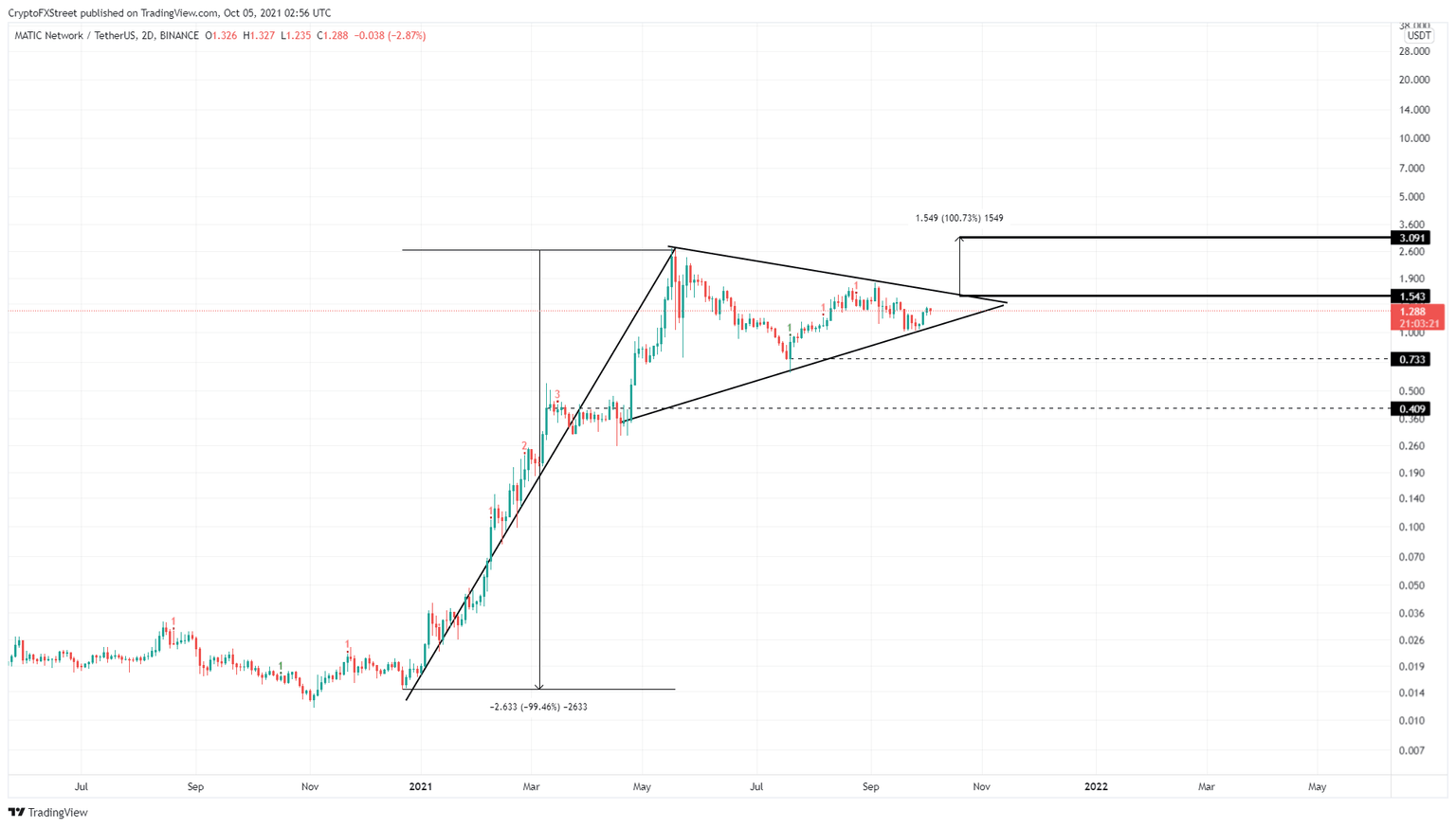 MATIC price has been consolidating since it set up a swing low on April 19. This coiling up phase comes after Polygon took off exponentially. Going forward, investors can expect a similar run-up due to the formation of a bullish continuation pattern.