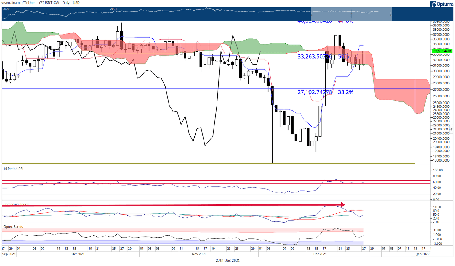 Yearn Finance price action is developing a particularly bearish chart pattern in the form of a head-and-shoulders pattern on its $250/3-box reversal Point and Figure chart, warning of a nearly 25% drop coming up. Yearn Finance price has been stuck inside the Ichimoku Cloud n the daily chart since December 22.