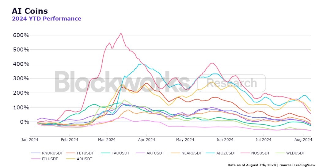 The Artificial Intelligence (AI) sector in the crypto market has a few protocols whose tokens have generated significant yields for users since the beginning of 2024. AI is one of the best-performing crypto asset classes in 2024, according to BlockWorks data.