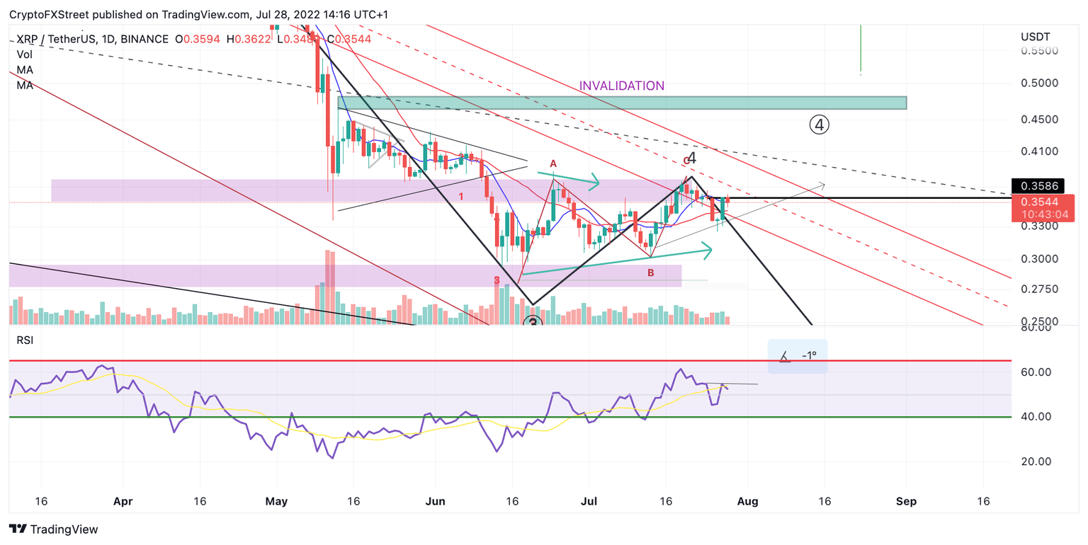 Ripple price shows reasons to remain concerned. On July 26, 2022, a warning was issued as the Ripple price was rejected from a historical trend line dating back to April 2021. The classical price action signature resembles textbook catalyst makers. Based on Elliot Wave and Fibonacci projections, a $0.24 target has been forecasted.