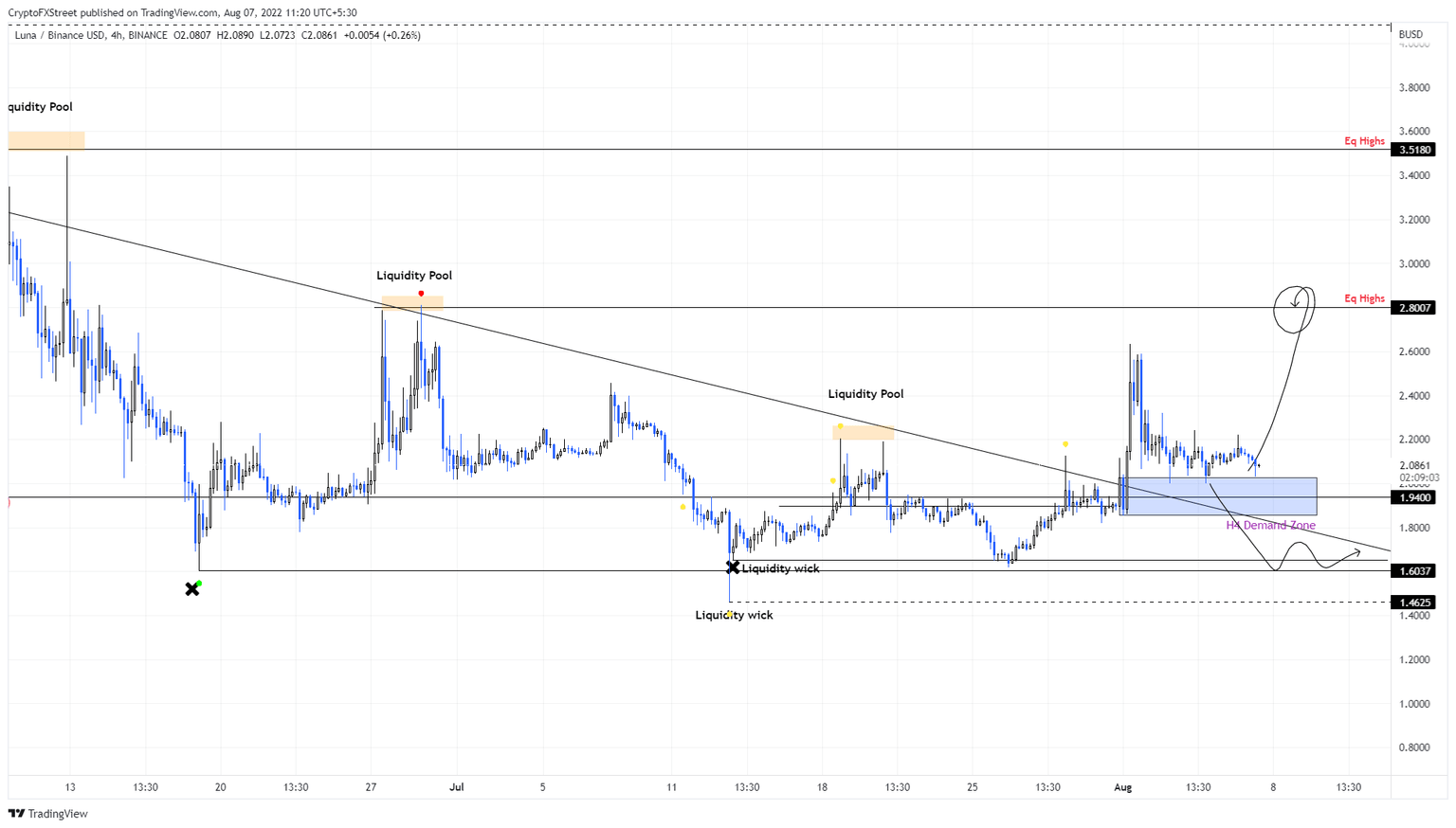 LUNA price shows a sign of healthy retracement after an egregious spike in buying pressure that triggered a quick and swift run-up. The ongoing pullback will provide investors with another chance to rally. LUNA price sliced through the two-month declining resistance level on August 1 by triggering a 41% ascent.