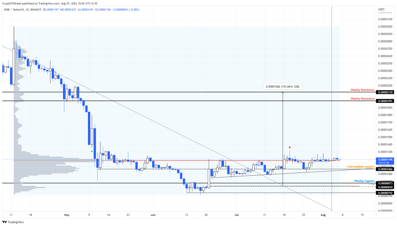 Shiba Inu price shows a tiring consolidation around the POC at $0.0000118. A breakdown of this level to fill the price in efficiency present at $0.0000083 seems plausible in the near future. If SHIB produces a daily candlestick close below the $0.0000074 support level, it will invalidate the bullish thesis.