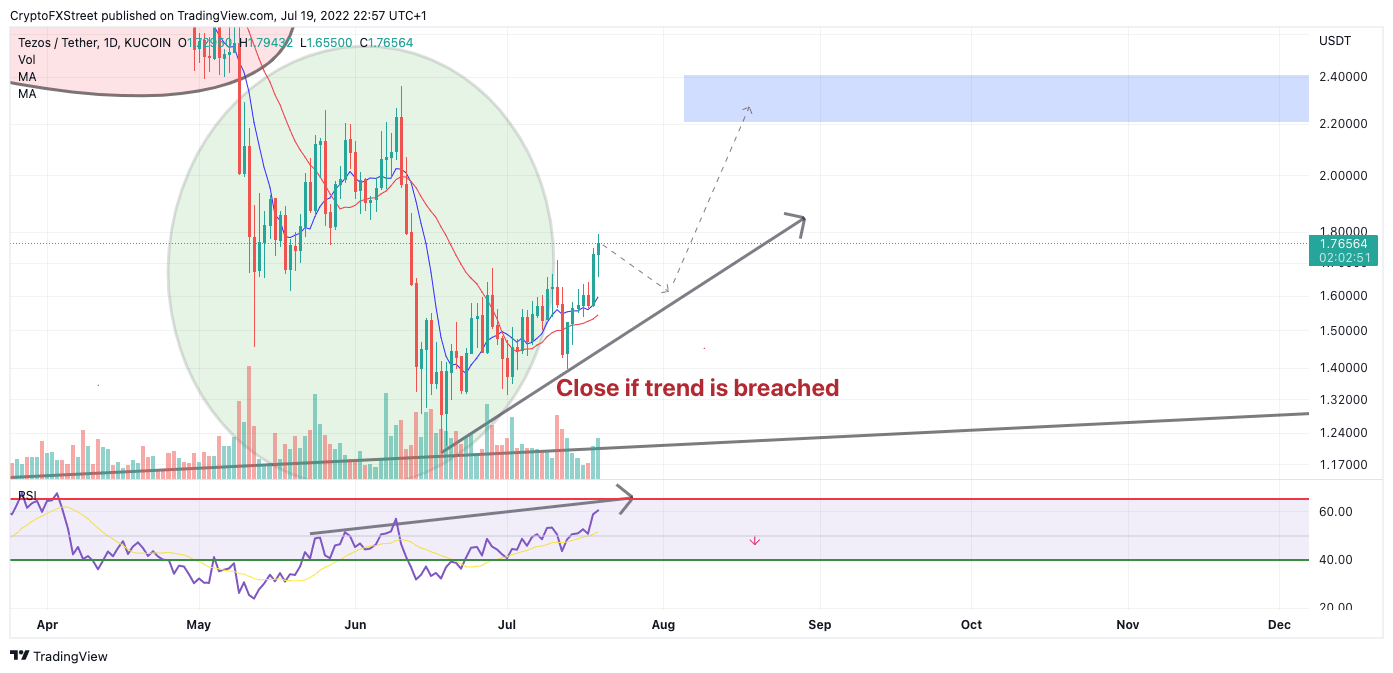 Tezos XTZ price shows reason to believe in more upside gain. Traders should stay with the counter-trend ascension until more evidence suggests otherwise. Tezos XTZ price currently trades at $1.76. Traders who partook in this month's bullish trade setup are currently seeing a profit of 15%.