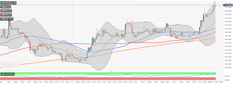 Ethereum’s price action took it above $151.00 to an intraday high of $151.61. The strong bullish move was triggered by a decisive breakthrough above $148.00. The prevailing short-term trend is bearish as the coin has been in retreat from the recent high, though the longer-term perspectives look good as long as it stays above $150.00.
