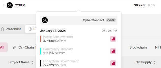CyberConnect (CYBER) price could be coiling up for a dump, as the network has a cliff token unlocks event tomorrow. According to the TokenUnlocks app, the network will be flooding 1.26 million CYBER tokens worth approximately $9.65 million. The volume of the unlocks represents nearly 8.5% of the asset’s supply.