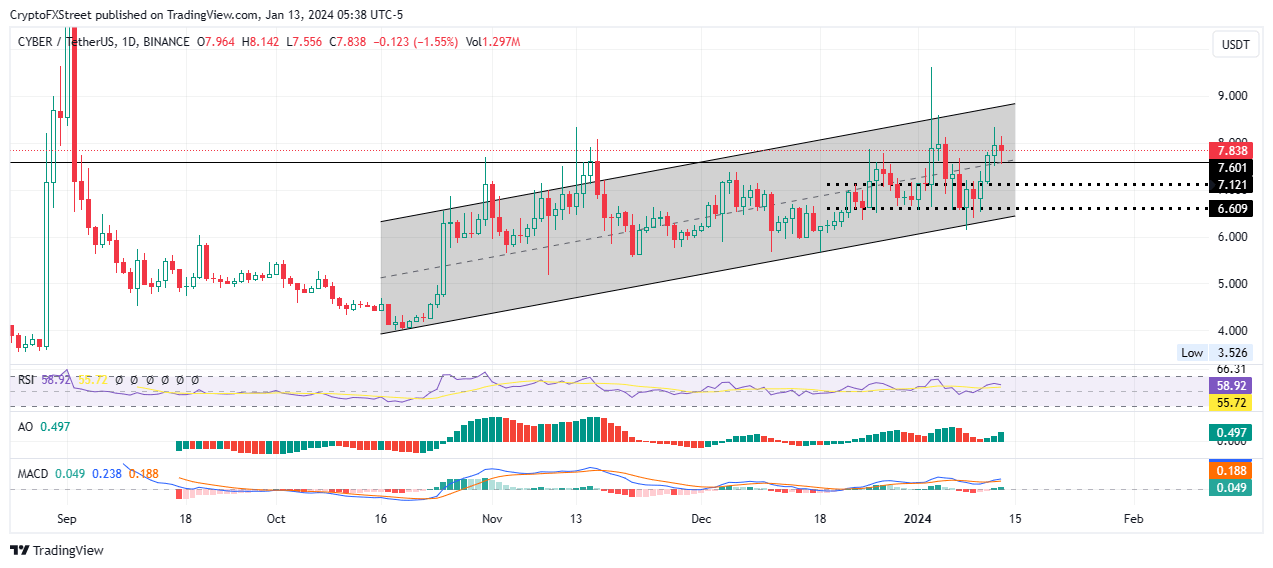 Conversely, if the bulls fasten their grip on CyberConnect price, it could push north, extending to break above the upper boundary of the channel. This could see CYBER price tag the $9.000 psychological level. In a highly bullish case, the gains could extend for the altcoin to reclaim the $9.696 range high, levels last tested on January 3.