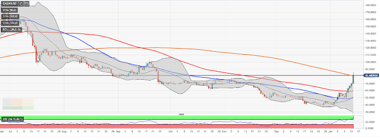 From the technical point of view, DASH surpassed SMA200 daily for the first time since July 27, 2019. While this development is regareded as a strong bullish signal, the charts imply that the correction may be underway as the daily RSI has entered an overbought territory. Moreover, the price rushed outside the Bollinger Band (daily), which is also a signal of an overstretched market.