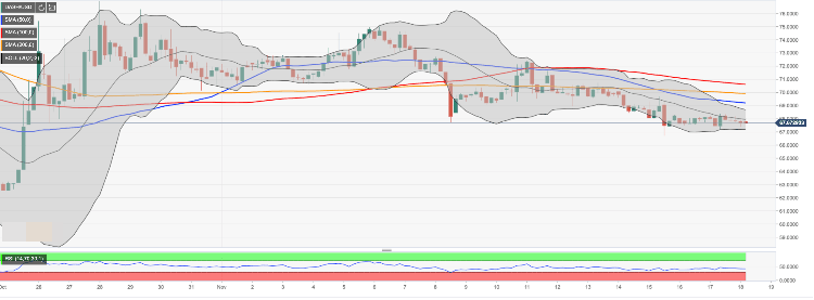 DASH/USD has been moving in a tight range limited by $67.00-$67.20 on the downside and $68.00 on the upside. The support area is created by the lower line of 4-hour Bollinger Band, while the upper boundary of the above-mentioned area is strengthened by the middle line of 4-hour Bollinger Band. Once it is out of the way, the upside is likely to gain traction with the next focus on $68.68 (the upper line of 4-hour Bollinger Band) and $69.20 (SMA50 (Simple Moving Average) 4-hour).