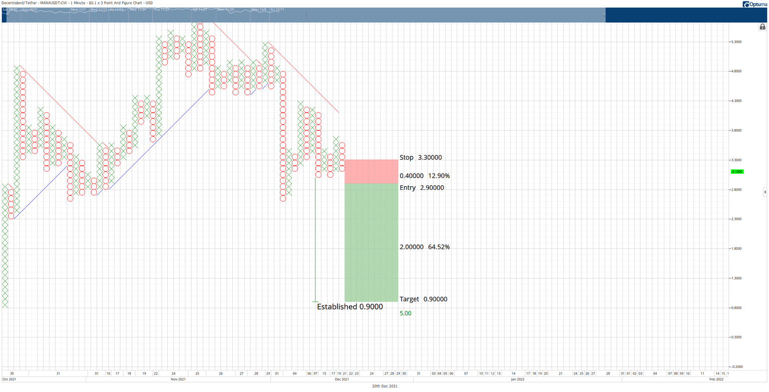 Decentraland price has a spectacular short opportunity developing on its Point and Figure chart. The theoretical short entry idea is a sell stop order at $2.90, a stop loss at $3.30, and a profit target at $0.90. A two to three-box trailing stop would help protect any profits after the entry.