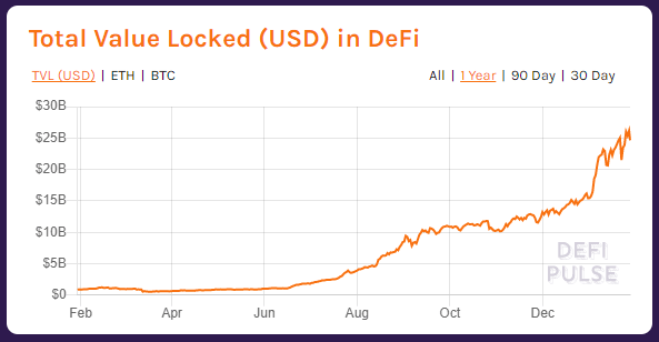 According to DeFi Pulse, the total value locked in DeFi platforms has already surpassed $25 billion US dollars - a mind-boggling figure considering it wasn’t until August 2020 that we saw DeFi surpass the $5bn mark. This indicates that the former sub-sector has now made itself known to mainstream financial institutions.