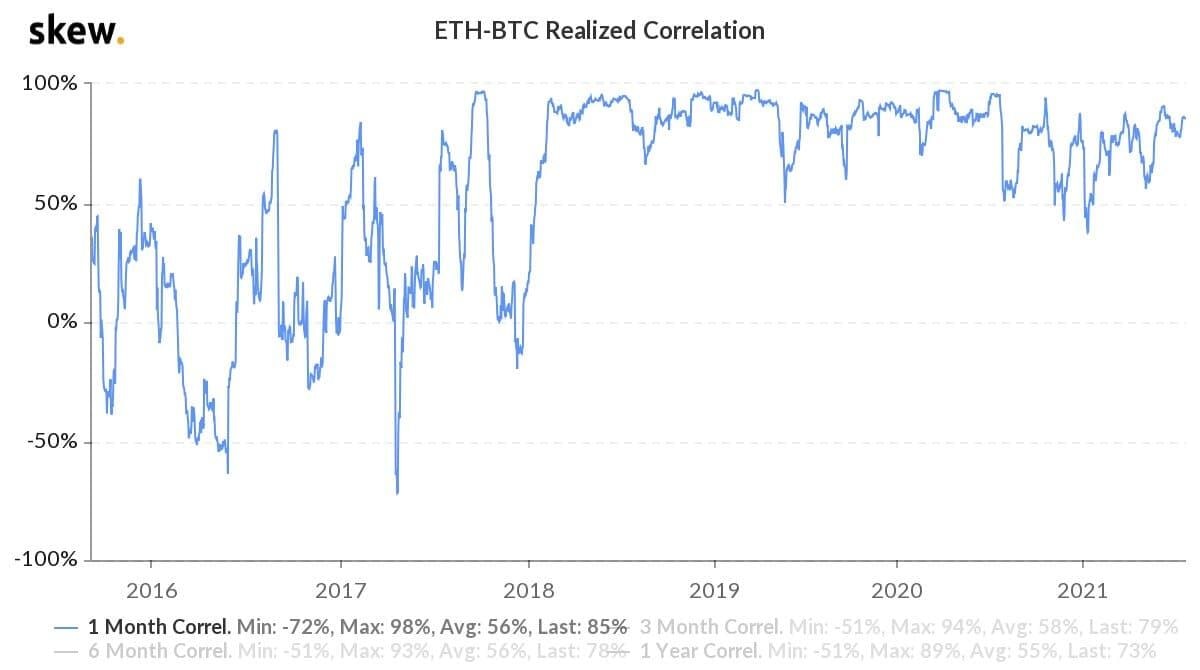 The realized correlation between Bitcoin and Ether has seldom dropped below 50% in the previous three years. Source: Skew