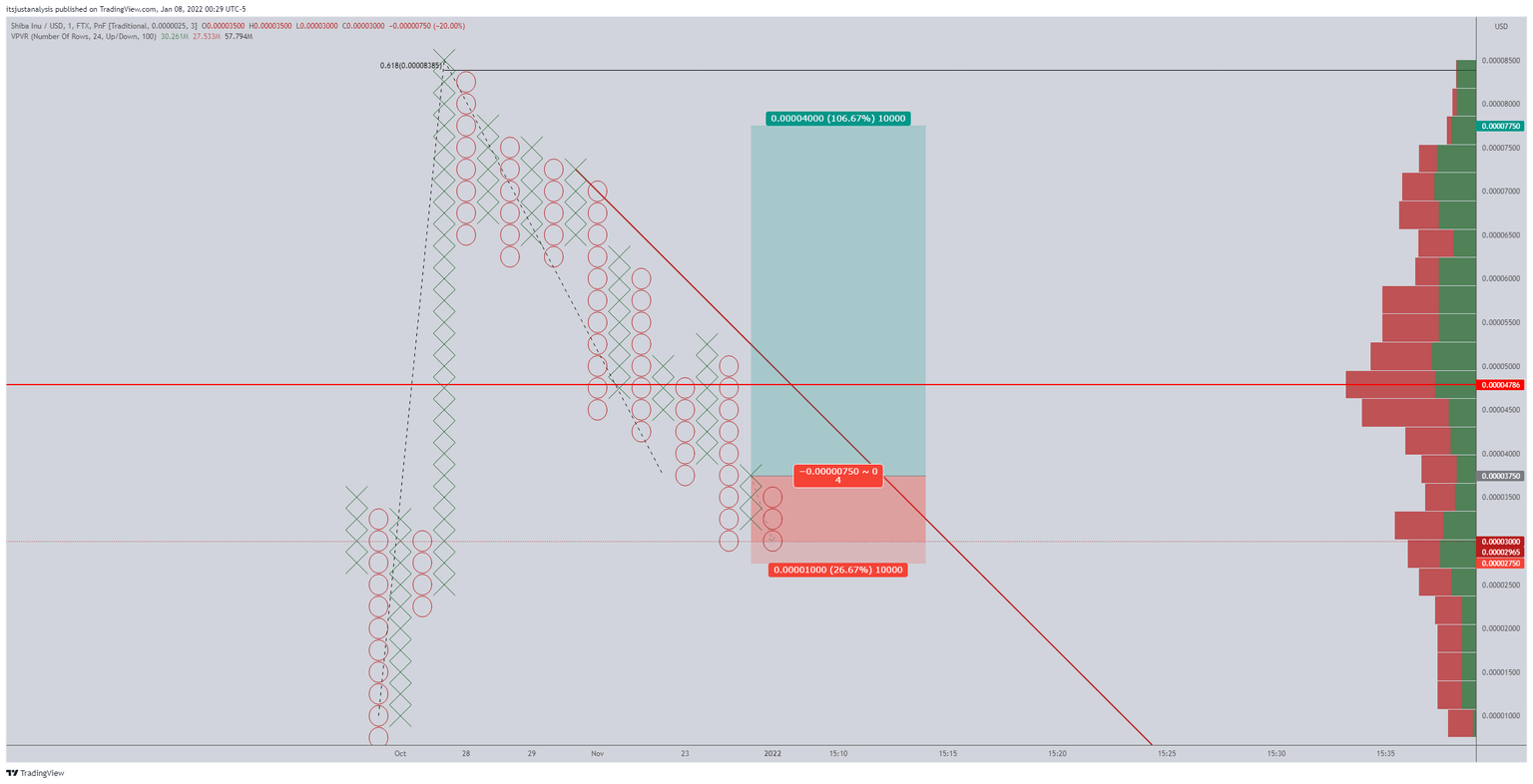 Shiba Inu price action on the $0.0000025/3-box reversal Point and Figure chart is mostly unchanged from the prior analysis. A theoretical long trade setup on the Point and Figure chart first identified in early December 2021 remains active. For traders who missed the entry, there is an opportunity to enter soon.
