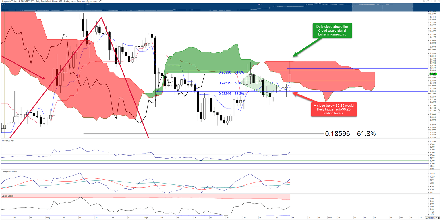 Dogecoin price has two primary resistance levels it needs to close above on the daily chart to continues its present momentum. The first is the weekly Tenkan-Sen and 61.8% Fibonacci retracement at $0.26. The second is the top of the daily Cloud (Senkou Span B) at $0.27.