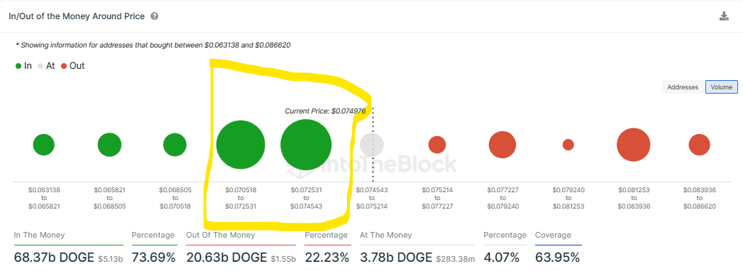 On the contrary, based on this on-chain metric, there are two major areas of interest between $0.070518 and $0.074543 that are filled by a high number of investors that had previously purchased DOGE around these price level. Here, roughly 377,620 addresses are holding nearly 58.02 billion DOGE. Any efforts to push Dogecoin price lower would be countered by buying pressure from almost 400,000 addresses.