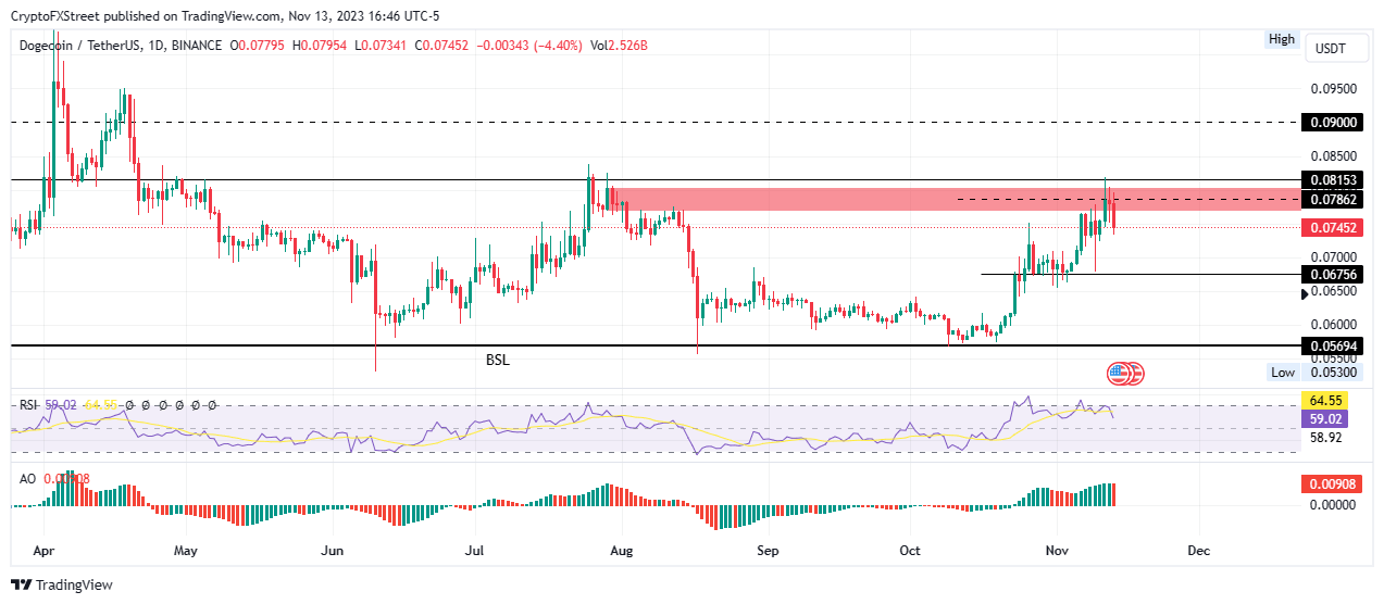 - Dogecoin price is down 5% after a rejection from $0.07862, the midline of a supply barrier extending from $0.07677 to $0.08039.