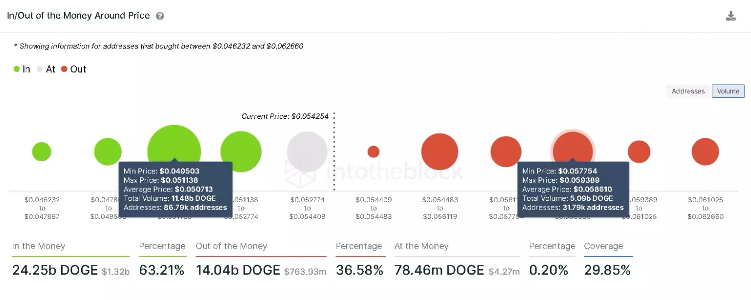 Adding credence to this bullish outlook is IntotheBlock’s In/Out of the Money Around Price (IOMAP) model, which shows the presence of stable support at $0.050, where nearly 87,000 addresses purchased roughly 11.48 billion DOGE.