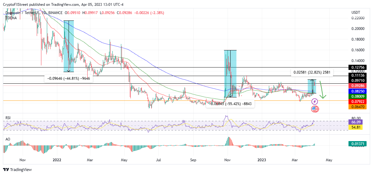 If profit-taking continues below $0.080, the Dogecoin price could lose the ground covered in the recent rally by tagging the 50-day EMA at $0.079. In the dire case, the dog-themed coin could plunge lower to reach the $0.064 swing low before a potential bounce. The move would denote a 30% decline from the current price of $0.093.