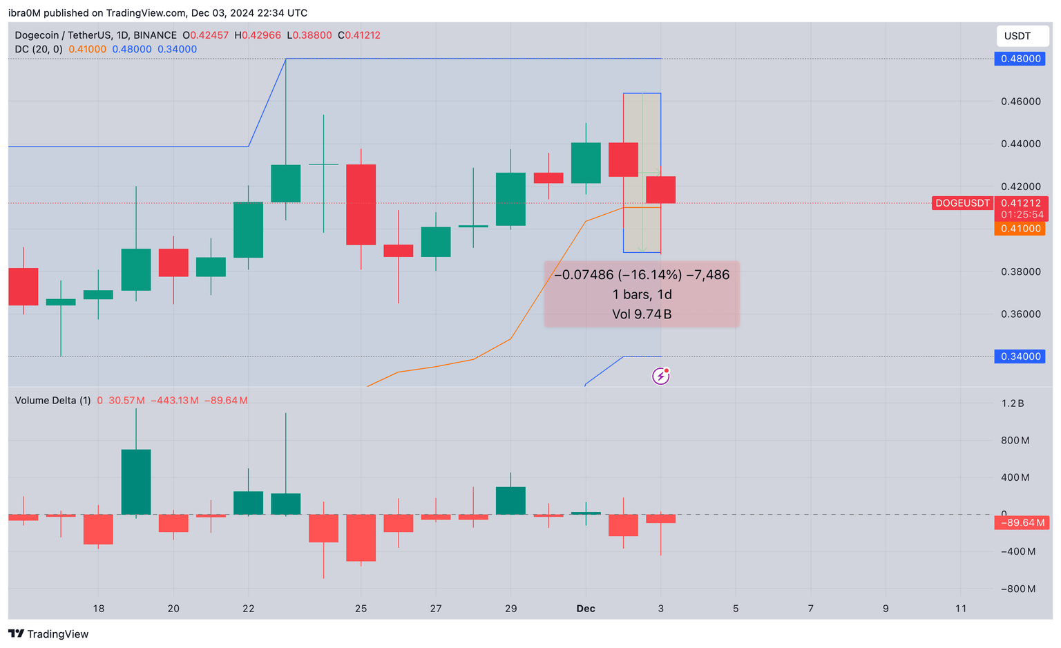 The Donchian Channel (DC) DOGE currently trades below the midline ($0.41), signaling growing bearish momentum. A multi-day close below the $0.41 could trigger further downswings towards the next key support level at $0.34.