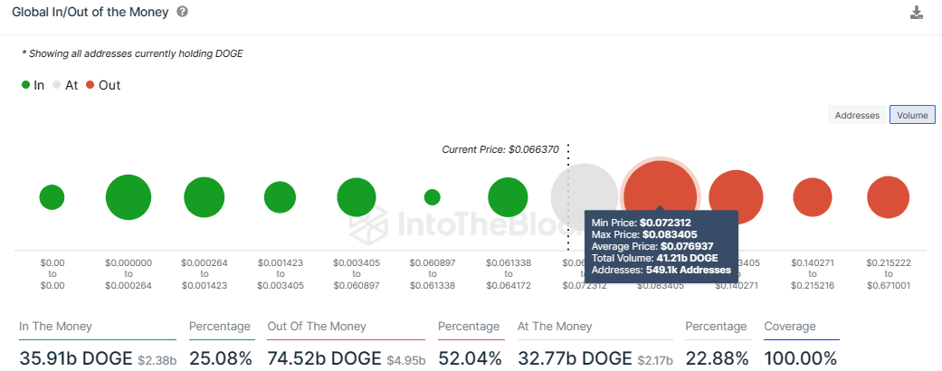 - DOGE could rise 10% to $0.0723 or fall 5% to immediate support at $0.0625, with 52% of holders incurring losses.