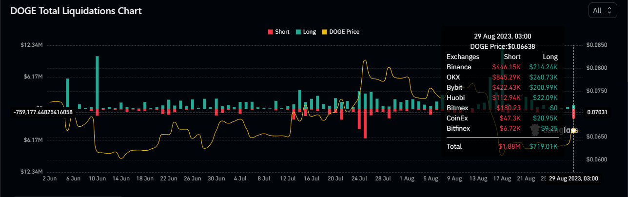 Dogecoin (DOGE) price rallying 5% to $0.0664, catalyzed by bullish developments in the crypto market, saw up to $1.88 million in short positions liquidated.