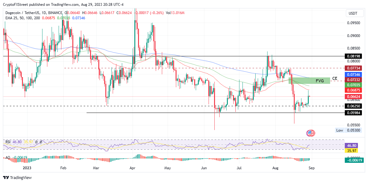 However, if bullish momentum overpowers selling pressure from the bears, Dogecoin price could flip this order block into a support level, to make it a bullish breaker. In such a case, the next optimistic target for DOGE would be the August 12 high at around $0.0773. This would constitute a 15% climb above current levels.