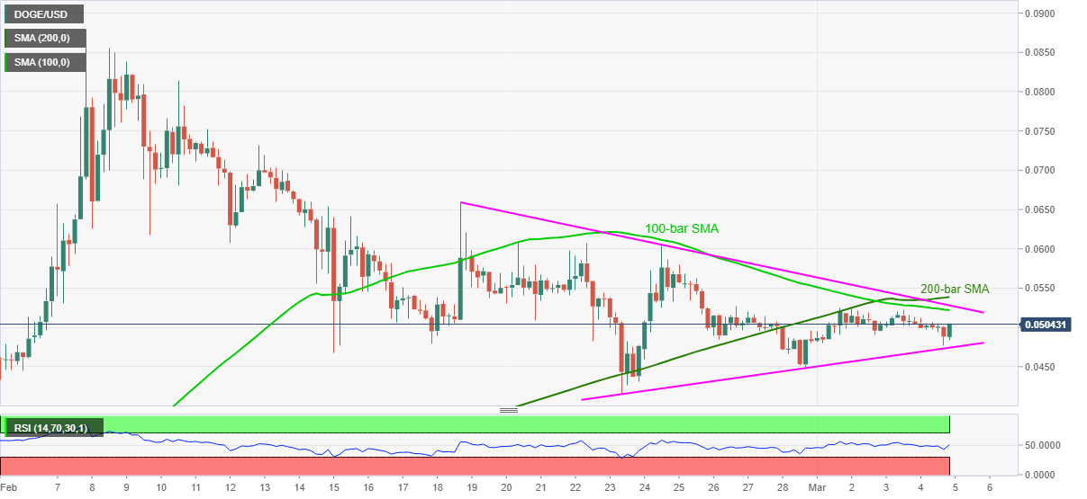 DOGE/USD rises to 0.0504 in its latest run-up during early Friday. In doing so, the meme-coin bounces off the lowest since Sunday while funneling down the breakout of a short-term symmetrical triangle.