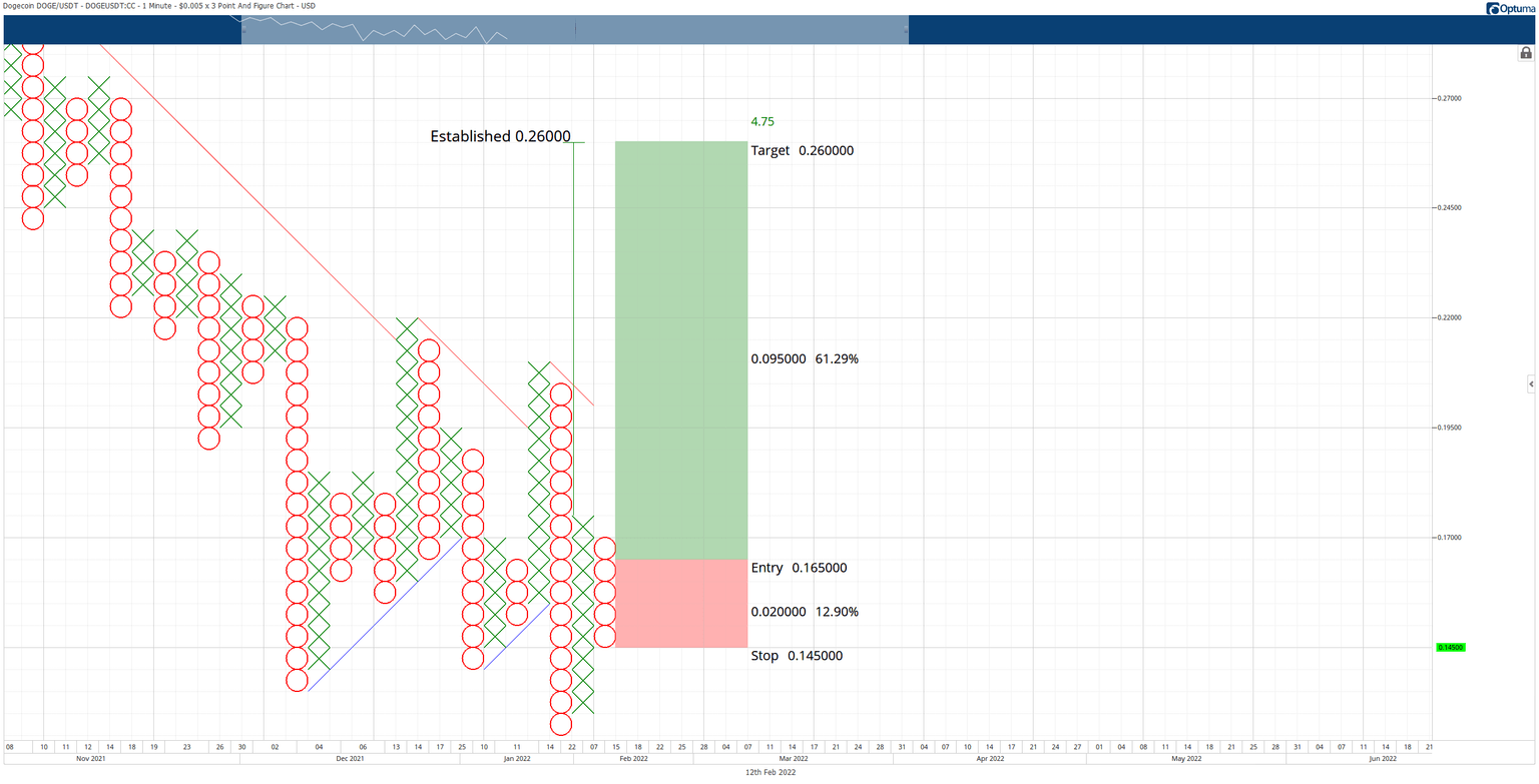 Dogecoin’s $0.005/3-box reversal Point and Figure chart compliments the reversal patterns developing on the candlestick chart. A hypothetical long opportunity now exists for Dogecoin price. The hypothetical setup is a buy-stop order at the three-box reversal of the current O-column ($0.165 at the time of publishing). The stop loss is a four-box stop and the profit target, based on the Vertical Profit Target method in Point and Figure analysis, is at $0.26.