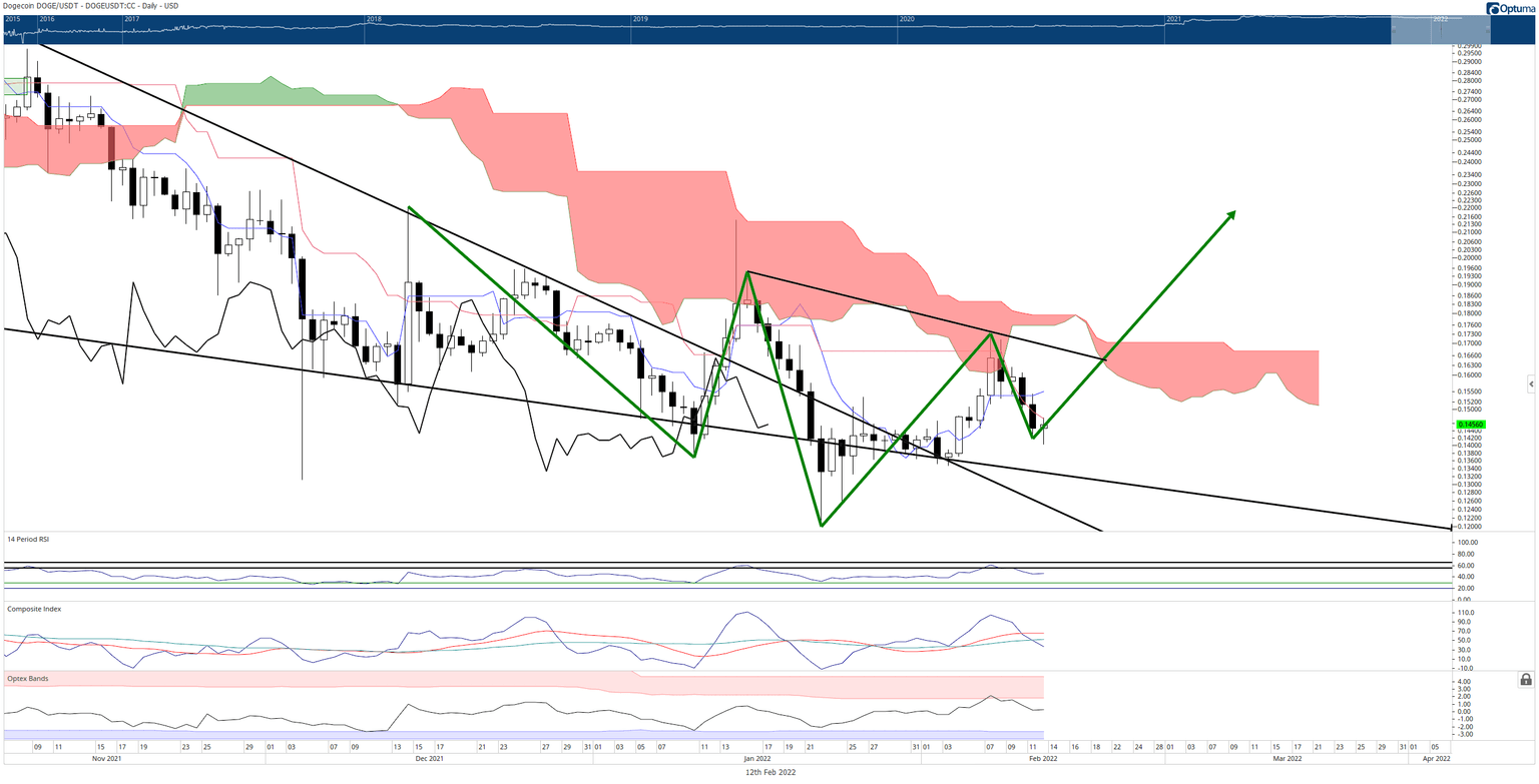 The result of these various whipsaws is a bullish reversal pattern currently in development: an inverse head-and-shoulders pattern. This pattern, if triggered, would likely generate the momentum necessary to put Dogecoin price into an Ideal Bullish Ichimoku Breakout on its daily chart while also returning it to the critical $0.25 price level.
