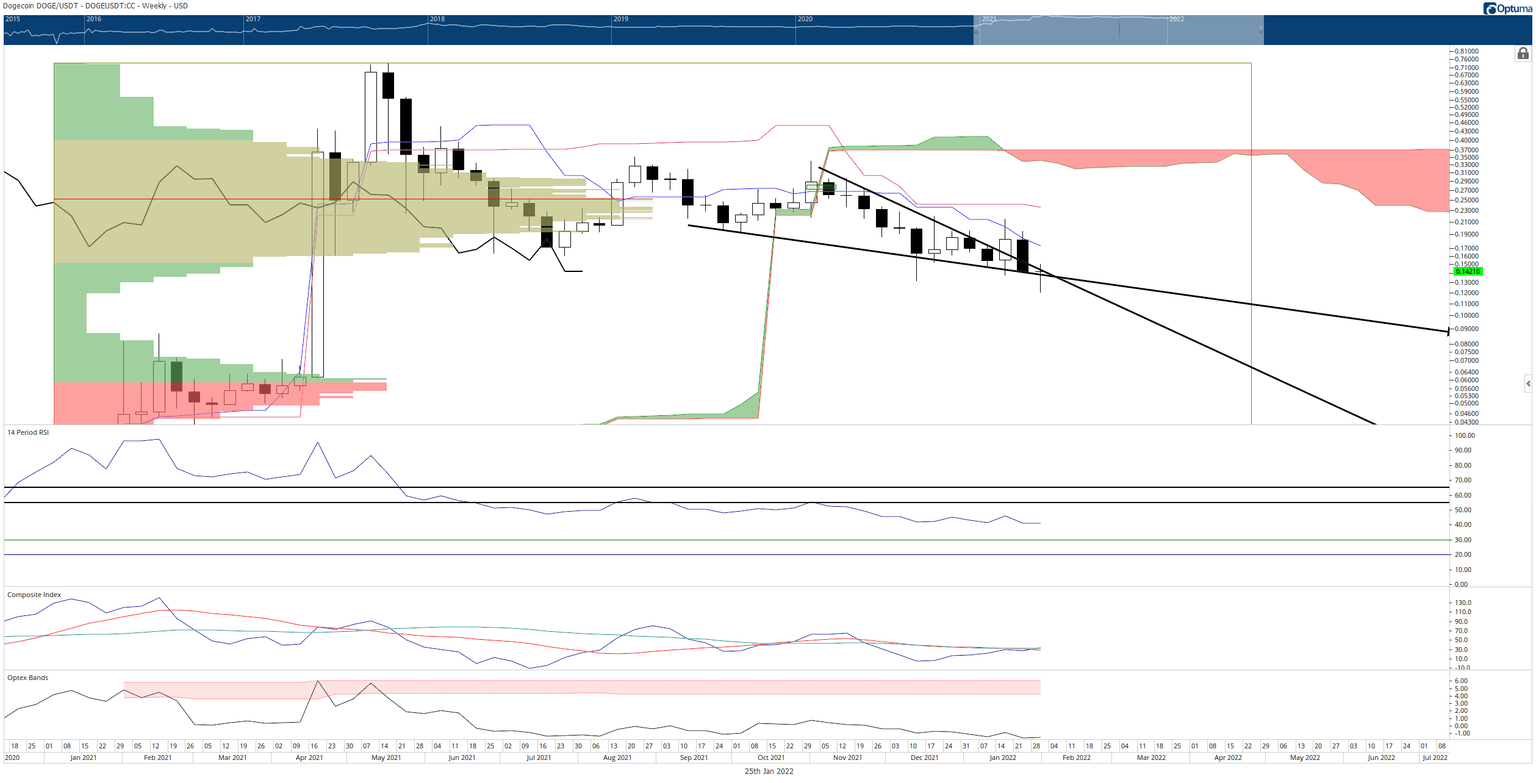 A weekly close below the falling wedge at $0.132 would invalidate any near-term bullish outlook.