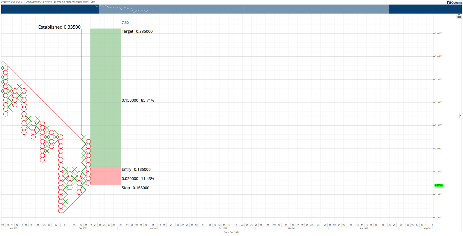 The hypothetical long entry is based on a 3-box reversal off the current column of Os, which is the first reversal column after Dogecoin price converted from a bear market into a bull market. In Point and Figure analysis, the pullback is viewed as a sign of strength, not weakness.