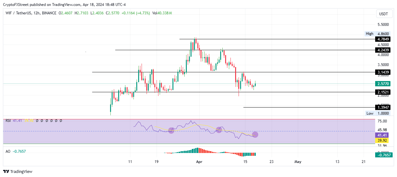However, if Bitcoin price makes another swing low, effectively sweeping altcoins down, Dogwifhat price could also fall. A break below $2.15 could ensue, driven by the presence of the bears in the market. This is shown by RSI position below the ‘50’ mean level as well as the position of the Awesome Oscillator (AO) in negative territory.