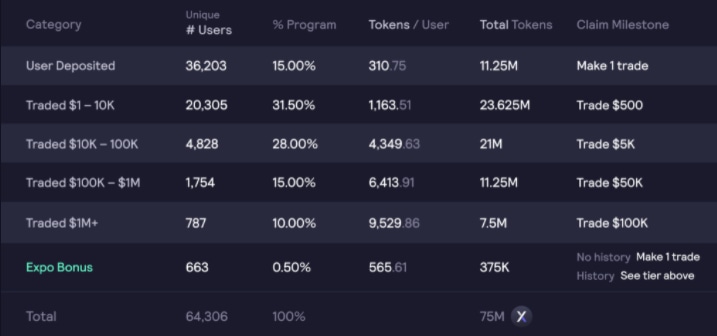 The number of tokens received by each user was determined by their previous trading actively on the platform, with the lowest tier user receiving 310 tokens for trading at least $1 on the exchange, and the highest tier user earning 9,529 tokens for trading volumes exceeding $1 million.