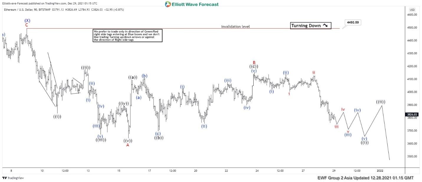 Rally in wave B ended at 4155 with internal subdivision as a zigzag. Up from wave A, wave ((a)) ended at 4094.78 and pullback in wave ((b)) ended at 3695.19. Final leg higher wave ((c)) ended at 4155 and this completed wave B. Wave C lower is currently in progress as a 5 waves impulse. Near term, expect a few more lows before ending wave ((i)) of C. Then Ethereum should rally in wave ((ii)) to correct the decline from December 23 wave B high before the decline resumes. As far as pivot at 4493.59 high remains intact, expect the crypto currency to continue to extend to the downside. Potential target lower is 100% – 161.8% Fibonacci extension from November 10, 2021 high which comes at 2234 – 3098.