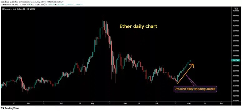 The second-largest cryptocurrency by market cap was trading 1.6% higher on the day near $2,600 at press time, having rallied 43% over an unbroken string of 12 straight daily price gains, according to Coinbase data.