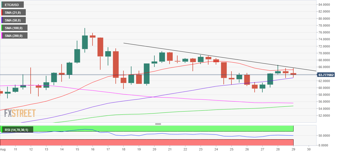 The upward-sloping 50-simple moving average (SMA) at $62.87 is guarding the downside over the past 36 hours while the ETC bulls continue to face stiff resistance at the falling trendline resistance at $65.81.
