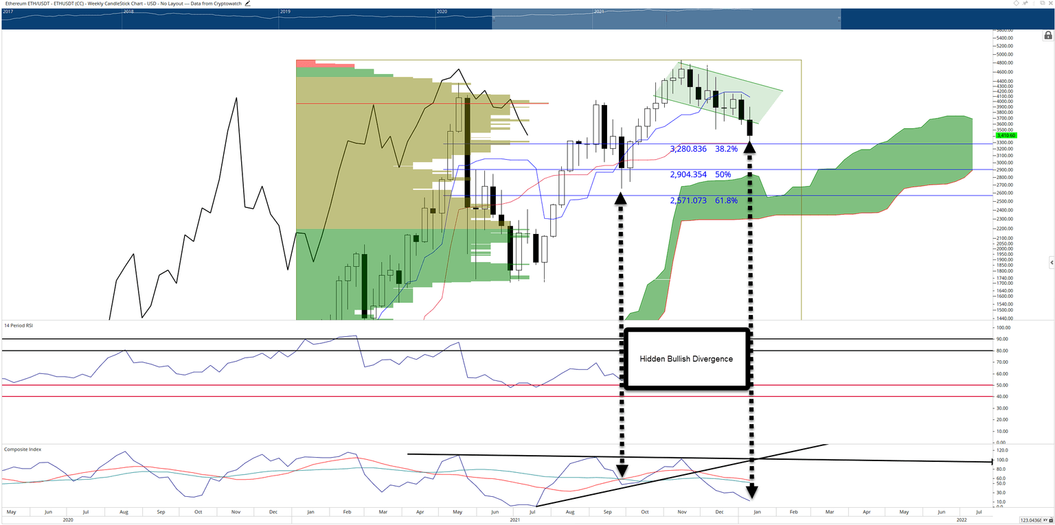 If traders are looking for solid evidence that a bottom is likely in and the bull market is about to resume, then hidden bullish divergence appearing while price hits a strong support zone is often all the evidence needed to confirm that future bullish movement. In addition, because a significant number of short positions were added after Etheruem price moved below the last bull flag, an incoming short squeeze will exacerbate any higher price movements.
