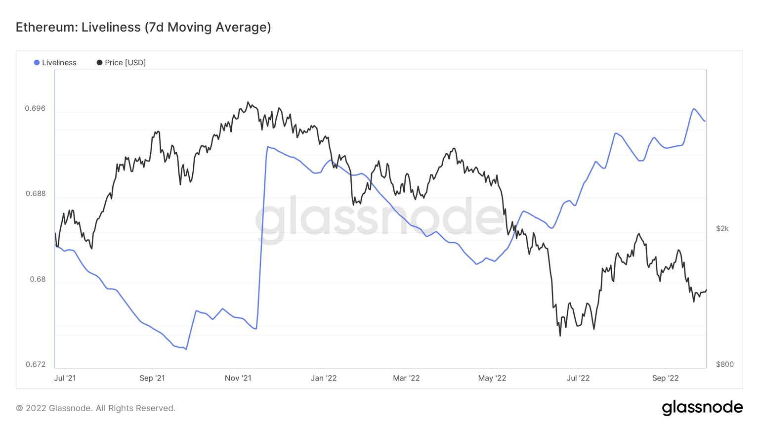 After maintaining bullishness since November 2021, ETH holders switched to saving their investments as much as possible. This resulted in the Liveliness of the asset rising gradually.
